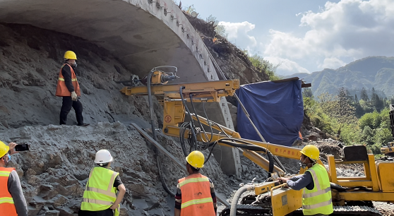 MGY-120G高臂多工藝鉆機,是重探公司在MGY-120H、MGY-90L全液壓錨固鉆機的基礎上研制開發的全新鉆機,它具有可根據水電廊道的大小選配給進行程,鉆進能力大,操作及運輸方便,結構新穎等特點。 該鉆機主要用于水利、水電站廊道、隧道、邊坡治理中錨固孔、排水孔、灌漿孔、檢測取芯孔施工,以及廊道管棚支護孔的施工。 3月下旬,該產品實現銷售,4月中旬在貴州某高鐵隧道項目的超前取芯鉆探施工中得到了業主、客戶、操作者的高度認可和驗收。該隧道項目具有巖層復雜,硬度差別大,孔深13.3米后才達到合適的取芯位置,前13.3米不能取芯的情況下,在我公司技術員指導下用潛孔錘跟管快速鉆進,鉆機速度大致為0.35米/分鐘。在鉆進13.3米后到達合適的取芯位置,采用單管高速取芯35米,取芯完整,平均取芯鉆進速度為0.2米/分鐘,35米取芯總耗時14.5小時。 客戶評價MGY-120G鉆進操作簡單,保養維護方便,鉆進速度快,取芯完整,作業范圍大等優點。