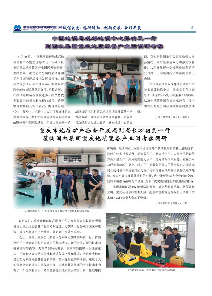 中地裝(重慶)地質(zhì)裝備有限公司(簡(jiǎn)稱“重慶地裝”)是直屬于中國機(jī)械工業(yè)集團(tuán)有限公司與中國地質(zhì)裝備集團(tuán)有限公司的中央在渝企業(yè)。公司于2025年由原中地裝重慶探礦機(jī)械有限公司(重探公司)與中地裝重慶地質(zhì)儀器有限公司(重儀公司)整合組建而成,秉承“服務(wù)國家戰(zhàn)略所需”的使命,專注于地質(zhì)裝備的研發(fā)、生產(chǎn)、銷售及技術(shù)服務(wù)。