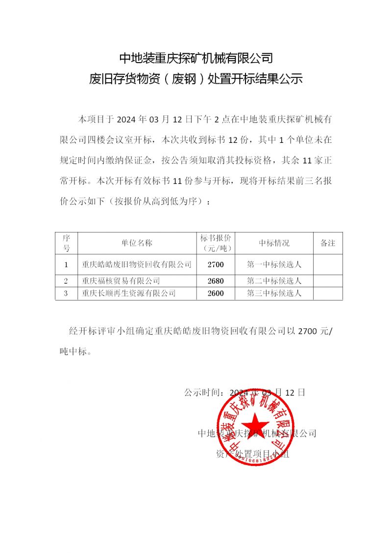 廢舊存貨物資(廢鋼)處置開(kāi)標(biāo)結(jié)果公示